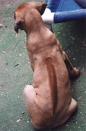 Allgemeines Erscheinungsbild: Ansehnlicher, kräftiger muskulöser und aktiver Hund; symemtrisch in seiner Erscheinung; er kann bei entsprechender Geschwindigkeit sehr ausdauernd sein. Ausgewachsene Tiere sind ansehnlich und stattlich. ![]() Einzigartig ist der Kamm auf dem Rücken ("ridge"), dessen Haare dem übrigen Körperhaar entgegengesetzt wachsen; dieser "ridge" muss als Erkennnungsmerkmal der Rasse angesehen werden. Der "ridge" muss sauber abgegrenzt, spitz zulaufend und symmetrisch sein. Er beginnt unmittelbar hinter den Schultern und setzt sich bis zu den Hüfthöckern fort, er weist nicht mehr als zwei gleichförmige Kronen (crowns) auf, die einander gegenüberliegend angeordnet sind. Die unteren Ränder der "crowns" dürfen ein Drittel der Gesamtlänge des "ridge" nicht überschreiten. Bis zu 5 cm ist ein guter Anhaltswert für die Breite des "ridge". Wesen: Erhaben, intelligent, Fremden gegenüber reserviert, jedoch ohne Anzeichen von Angriffslust oder Scheue. Kopf und Schädel: Von angemessener Länge, Schädel flach, ziemlich breit zwischen den Behängen, in gelassener Stimmung frei von Runzeln. Entsprechend gut ausgeprägter Stop, Nase im Einklang mit der Haarfarbe, schwarz oder braun. Bei schwarzer Nase dunkle, bei brauner Nase bernsteinfarbene Augen. Fang lang, tief und kräftig, Lefzen trocken und dicht abschliessend. Augen: Mässig weit voneinander angeordnet, rund, klar und strahlend, mit intelligentem Ausdruck. Die Augenfarbe ist passend zur Farbe des Haarkleides. Behang: Ziemlich hoch angesetzt, von mittlerer Grösse, ziemlich breit am Ansatz, allmählich bis zu einer abgerundeten Spitze hin schmaler werdend. Dicht am Kopf anliegend getragen. Fang, Gebiss: Kräftiger Kiefer mit einem perfekten, regelmäßigen und vollständigen Scherengebiss, wobei die obere Schneidezahnreihe ohne Zwischenraum über die untere greift und die Zähne senkrecht im Kiefer stehen. Zähne, insbesondere die Fangzähne, kräftig ausgebildet. Hals: Ziemlich lang, stark und ohne lose Kehlhaut. Vorhand: Schultern schräg, trocken und gut bemuskelt. Absolut gerade, starke, mit kräftigen Knochen ausgestattete Vorderläufe; Ellenbogen dicht am Körper anliegend. Gebäude: Brustkorb nicht zu breit, sehr tief und geräumig, Rippenkorb mäßig gewölbt, keinesfalls tonnenförmig, Rücken kraftvoll, Lenden kräftig, muskulös und leicht gebogen. Hinterhand: Trockene, klar abgezeichnete Muskulatur, Kniegelenk gut gewinkelt, tiefstehende Sprunggelenke. Pfoten: Kompakt, mit gut gewölbten Zehen, rund, strapazierfähig, gut elastische (gut gepolsterte) Ballen, durch Haarwuchs zwischen den Zehen und Ballen geschützt. Rute: Am Ansatz stark, weder hoch noch tief angesetzt, sich zur Spitze hin verjüngend, niemals plump. Sie wird erhoben und aufwärts getragen, jedoch niemals eingerollt. Gangart / Bewegung: Gerade, frei und rege. Haarkleid: Kurz und dicht, glatt und glänzend im Aussehen, jedoch niemals wollig oder seidig. Farbe: Hellweizenfarben bis rotweizenfarben. Kopf, Rumpf, Läufe und Rute von einheitlicher Farbe. Kleine weisse Abzeichen an der Brust und an den Zehen statthaft, jedoch ist viel weißes Haar an diesen Körperpartien, am Bauch oder oberhalb der Pfoten unerwünscht. Weiße Zehen sind nicht erwünscht. Fang und Ohren dürfen dunkel sein. Größe: Widerristhöhe für Rüden: erwünscht mindestens 63,0 cm - höchstens 68,5 cm Widerristhöhe für Hündinnen: erwünscht mindestens 61,0 cm - höchstens 66,0 cm Fehler: Jede Abweichung von den vorgenannten Punkten sollte als Fehler angesehen werden, dessen Bewertung im genauen Verhältnis zum Grad seiner Abweichung stehen sollte. Anmerkung: Rüden sollten zwei offensichtlich normal entwickelte Hoden aufweisen, die sich vollständig im Skrotum befinden. |